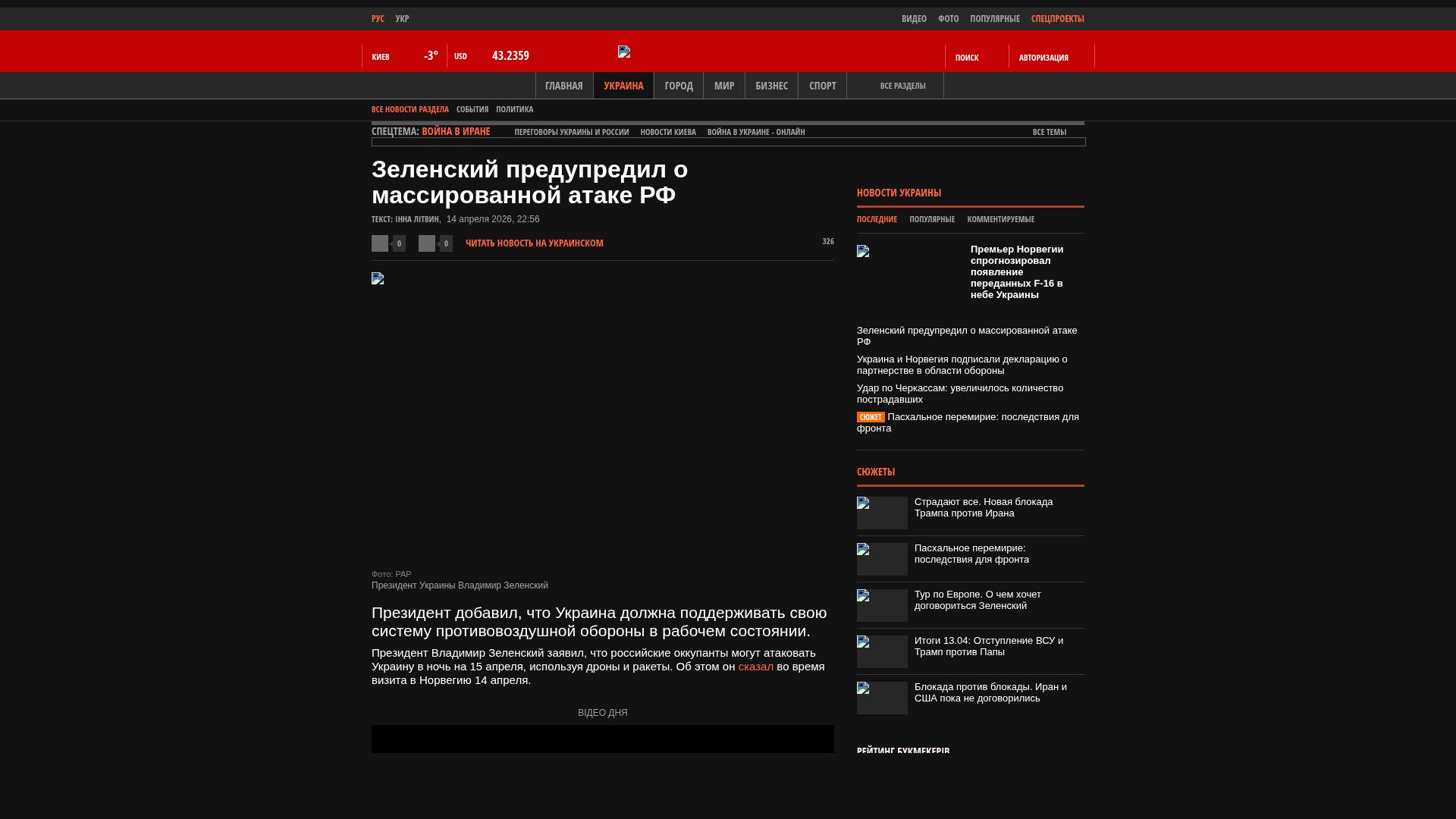 Präsident Wolodymyr Selenskyj erklärte, dass die russischen Angreifer die Ukraine in der Nacht zum 15. April mit Drohnen und Raketen angreifen könnten. Dies sagte er während seines Besuchs in Norwegen am 14. April.