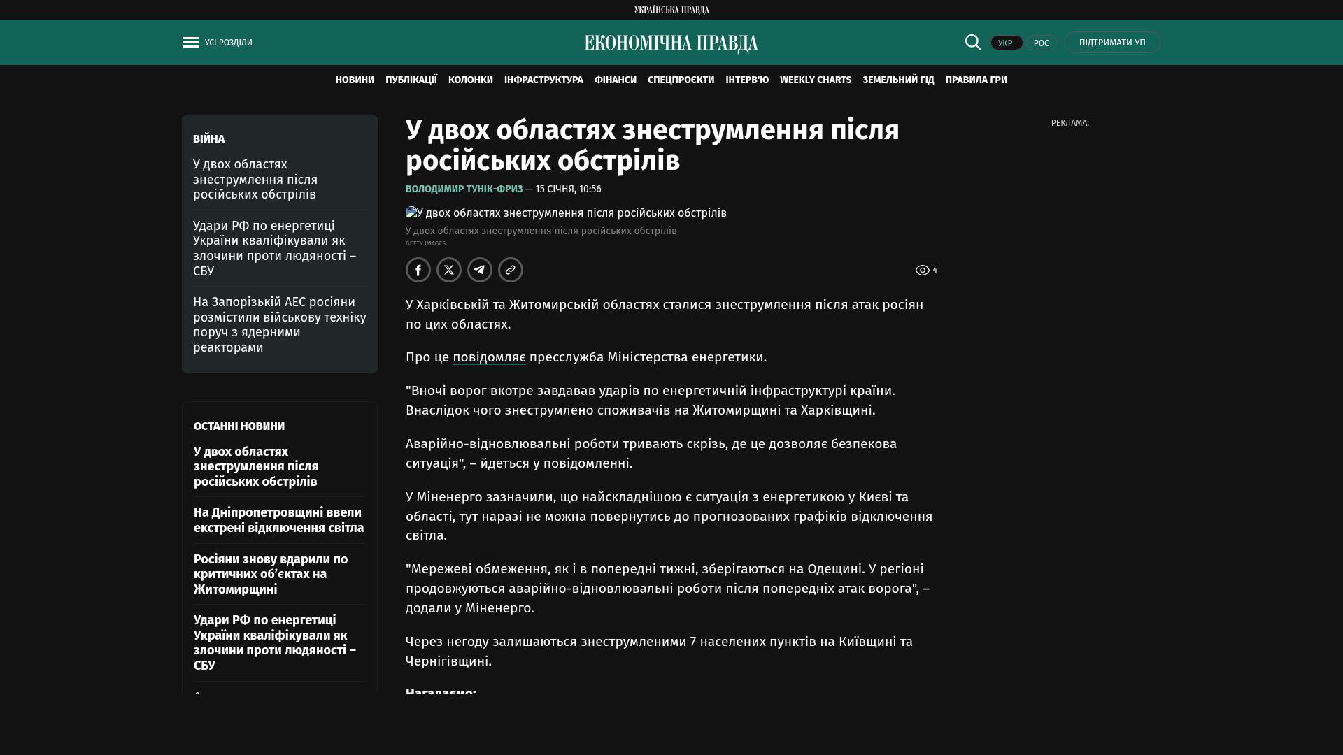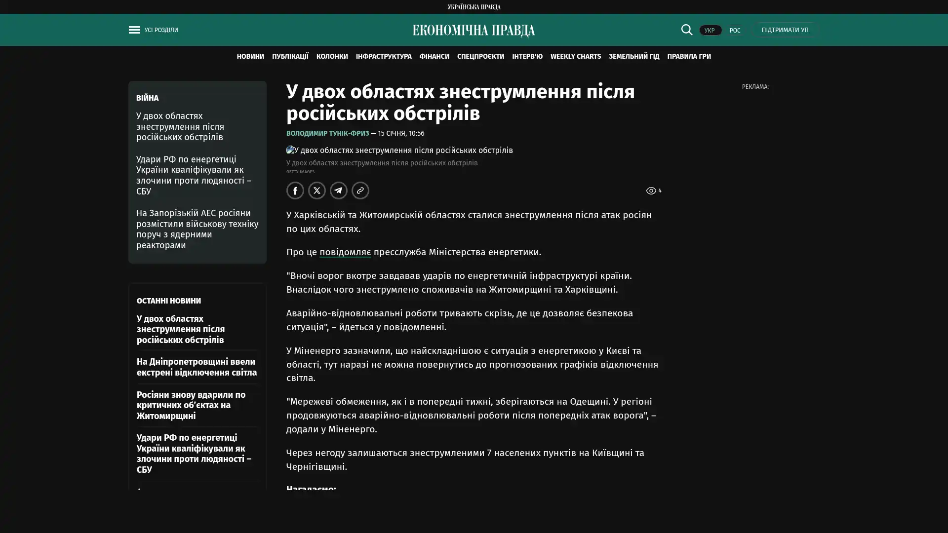 „In der Nacht hat der Feind wieder einmal die Energieinfrastruktur des Landes angegriffen. Infolgedessen waren die Verbraucher in den Regionen Schytomyr und Charkiw von der Stromversorgung abgeschnitten.