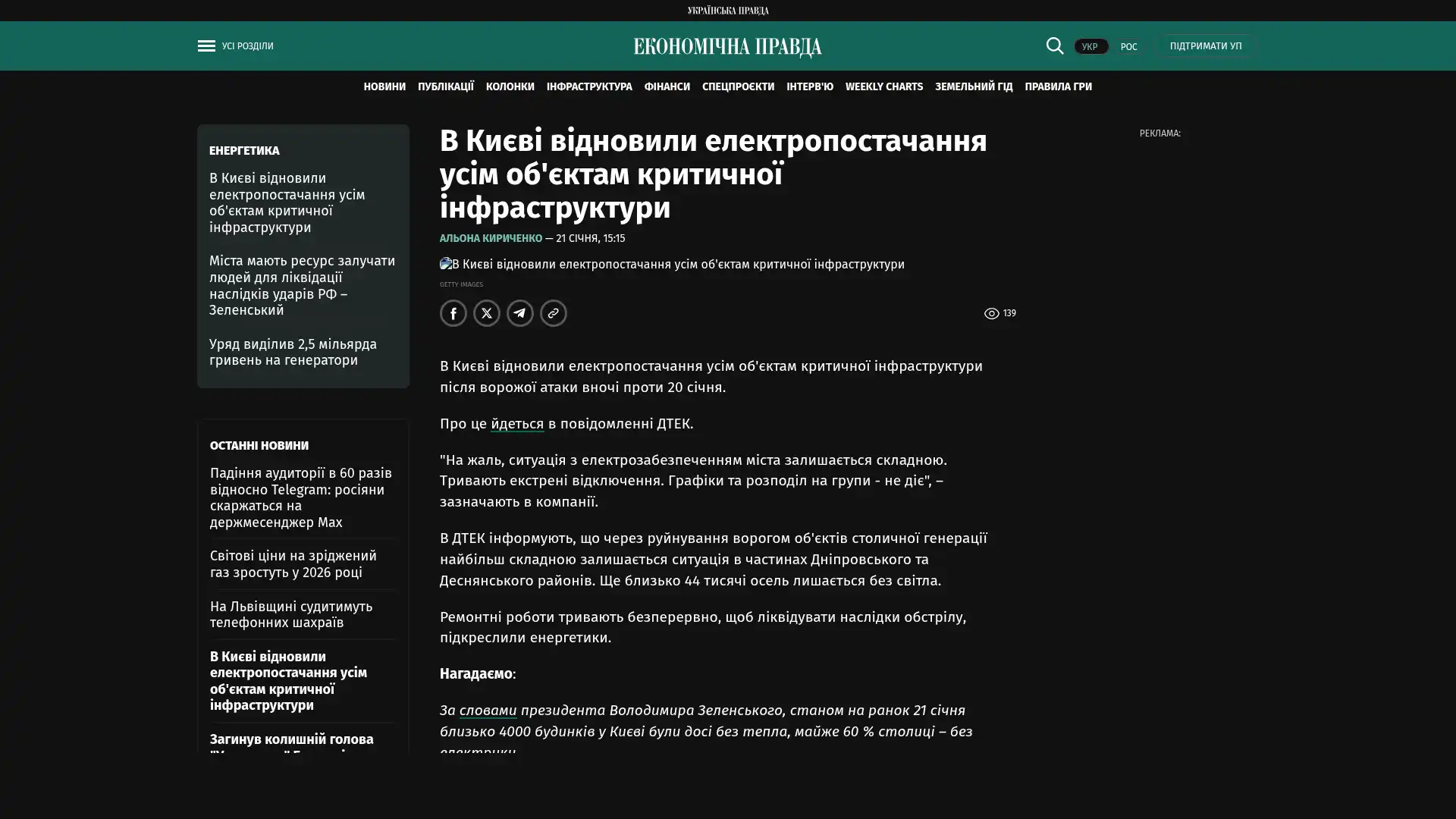 Die Stromversorgung aller kritischen Infrastruktureinrichtungen in Kiew ist nach einem feindlichen Angriff in der Nacht des 20. Januar wiederhergestellt worden.