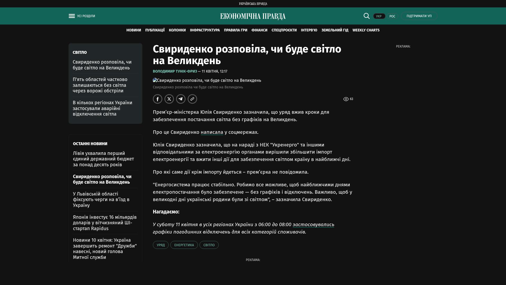 Ministerpräsidentin Julija Swyrydenko erklärte, dass die Regierung Maßnahmen ergriffen habe, um an Ostern eine Stromversorgung ohne Stromausfälle zu gewährleisten.