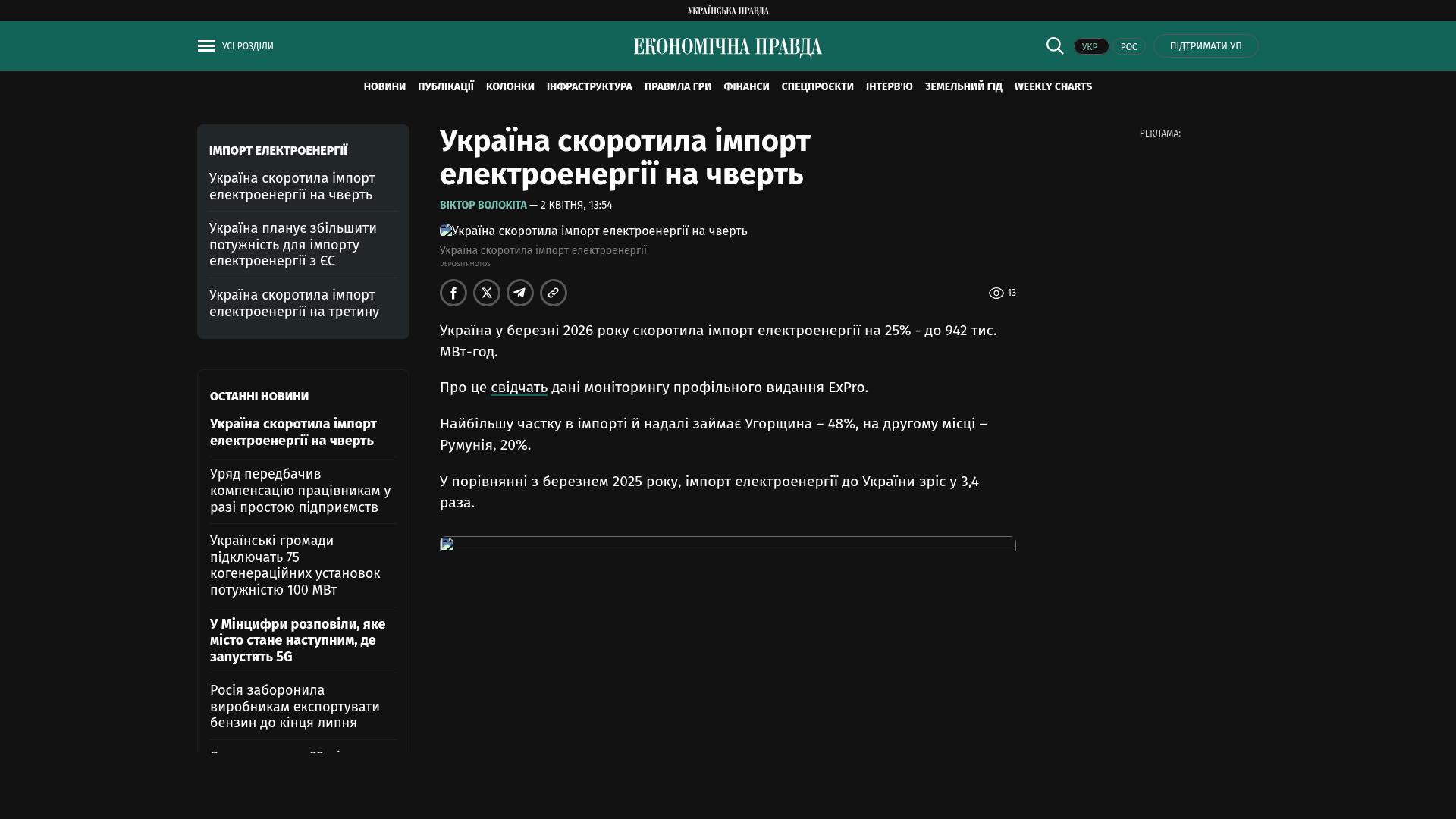 Im März 2026 hat die Ukraine ihre Stromimporte um 25 % auf 942.000 MWh reduziert.