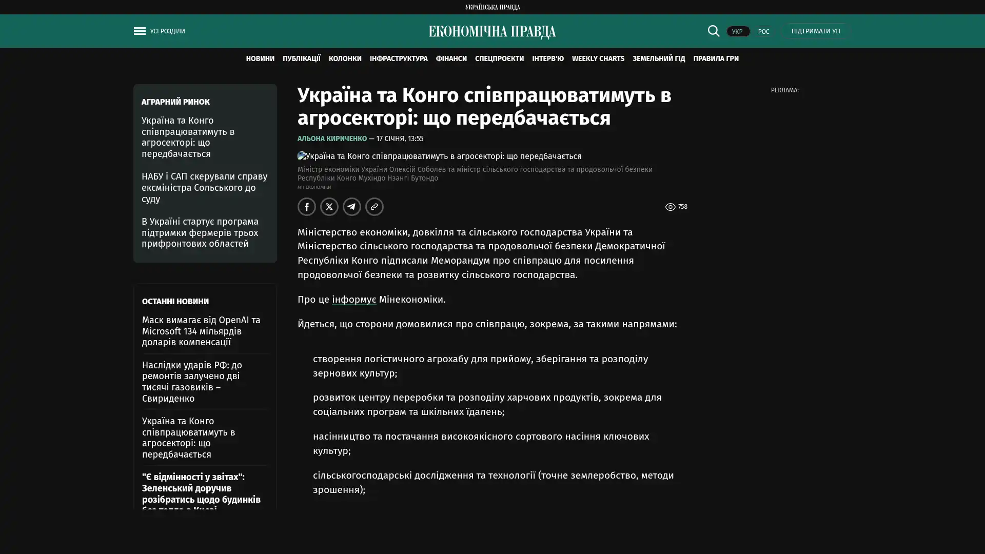 Das Ministerium für Wirtschaft, Umwelt und Landwirtschaft der Ukraine und das Ministerium für Landwirtschaft und Ernährungssicherheit der Demokratischen Republik Kongo haben ein Memorandum über die Zusammenarbeit zur Stärkung der Ernährungssicherheit und der landwirtschaftlichen Entwicklung unterzeichnet.
