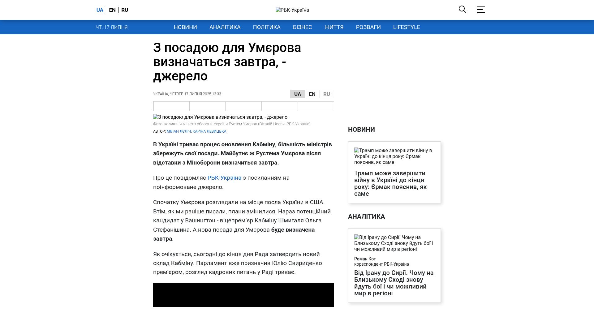 Bildschirmfoto des Originalartikels auf rbc.ua