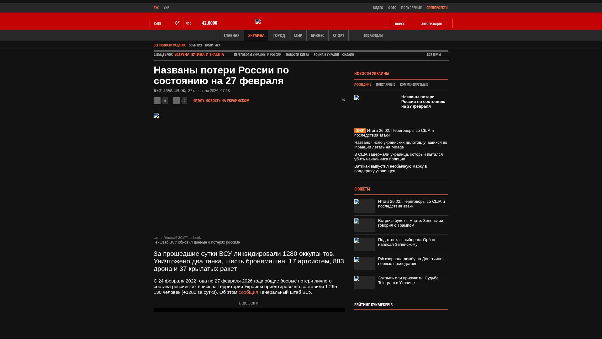 Vom 24. Februar 2022 bis zum 27. Februar 2026 beliefen sich die Gesamtverluste an russischem Personal auf dem Territorium der Ukraine auf schätzungsweise 1.265.130 Personen (+1.280 pro Tag). Dies wurde vom Generalstab der ukrainischen Streitkräfte mitgeteilt.