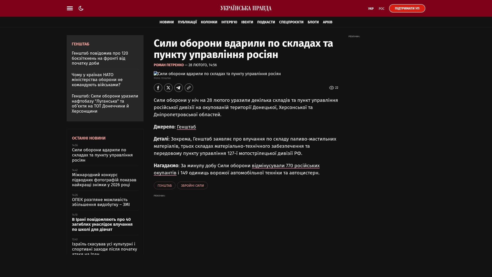 In der Nacht zum 28. Februar haben die Verteidigungskräfte mehrere Lagerhäuser und Kommandozentralen der russischen Division in den besetzten Gebieten der Regionen Donezk, Cherson und Dnipropetrowsk angegriffen.