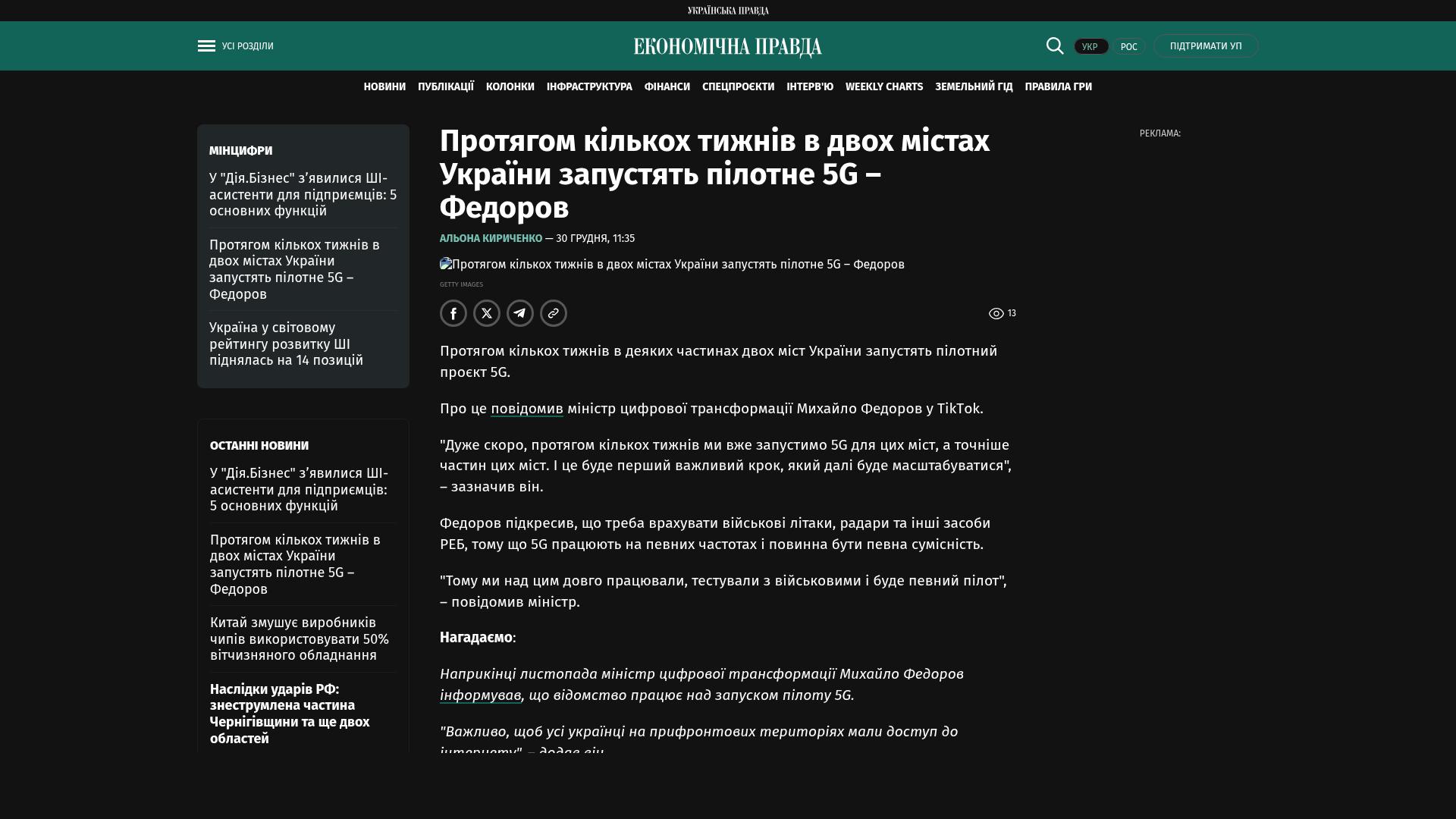 Ende November teilte der Minister für digitale Transformation Mykhailo Fedorow mit, dass das Ministerium daran arbeitet, einen 5G-Piloten zu starten. „Es ist wichtig, dass alle Ukrainer in den Frontgebieten Zugang zum Internet haben“, fügte er hinzu.